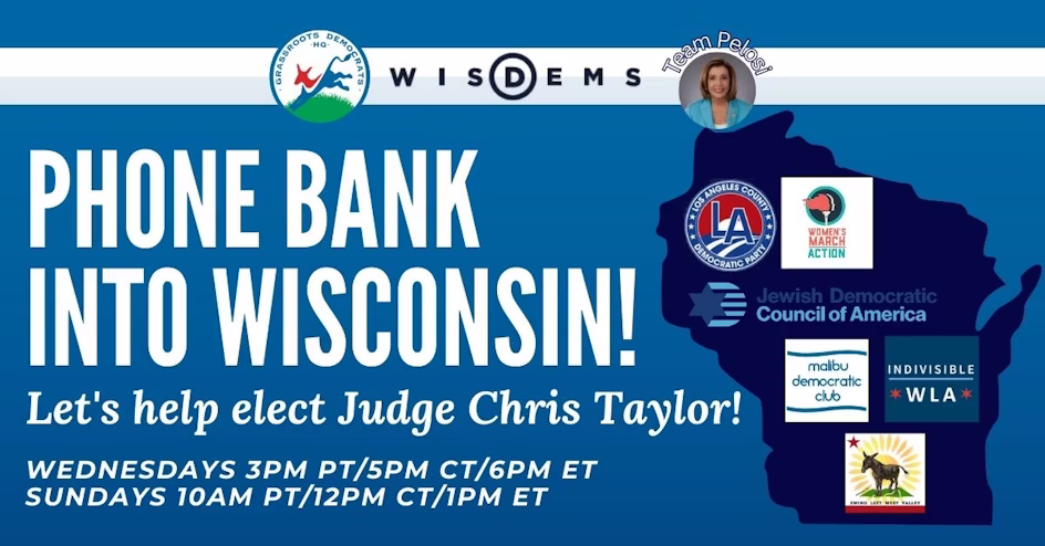 in partnership with WisDems, Indivisible West Los Angeles, Jewish Democratic Council of America, Los Angeles County Democratic Party, Malibu Democratic Club, Swing Left West Valley, Team Pelosi, and Women's March Action Join Grassroots Democrats HQ and WisDems every week on Wednesdays and Sundays to call voters! We’ll be making calls to talk to voters in...